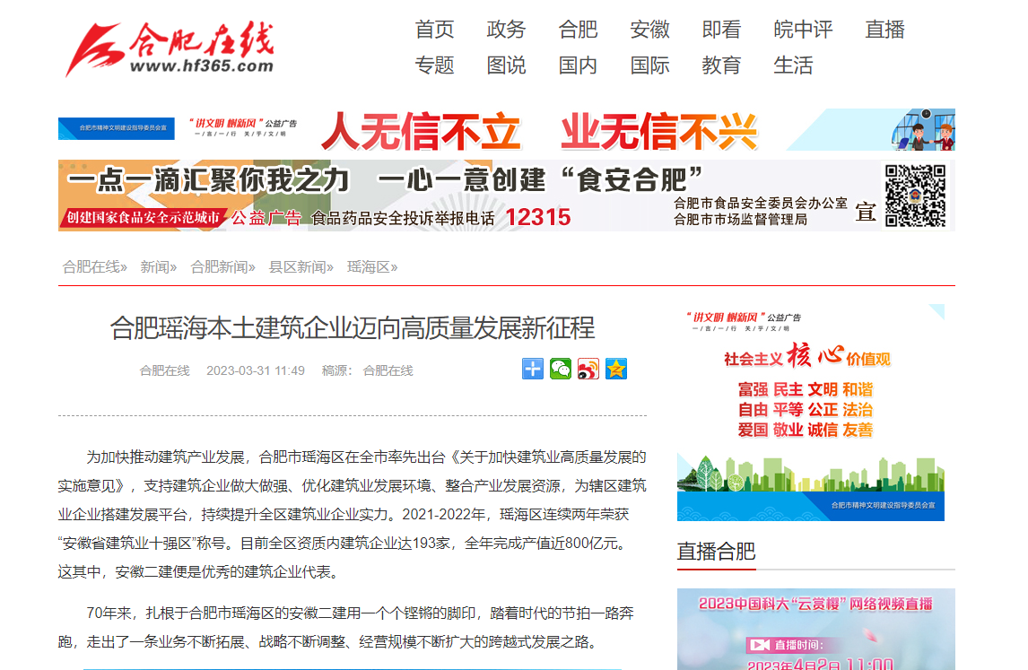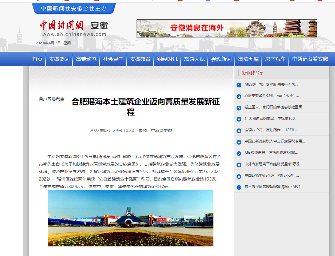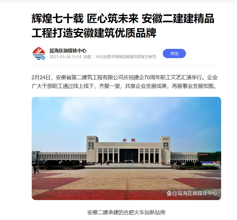 近日,新華網(wǎng)安徽頻道、中國商報網(wǎng)、中新網(wǎng)安徽頻道、市場星報、合肥在線、今日頭條-瑤海宣傳、瑤海區(qū)融媒體中心、金臺資訊、網(wǎng)易新聞、搜狐新聞、騰訊網(wǎng)、大公網(wǎng)等多家平臺媒體相繼報道安徽二建公司70周年發(fā)展成就。