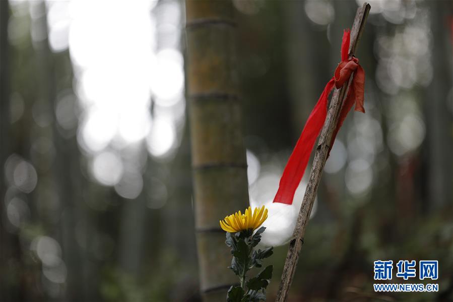 福建武夷山洋莊鄉小漿村張山頭紅軍墓冢上的編號和紅飄帶(3月25日攝)。新華社記者劉芳攝