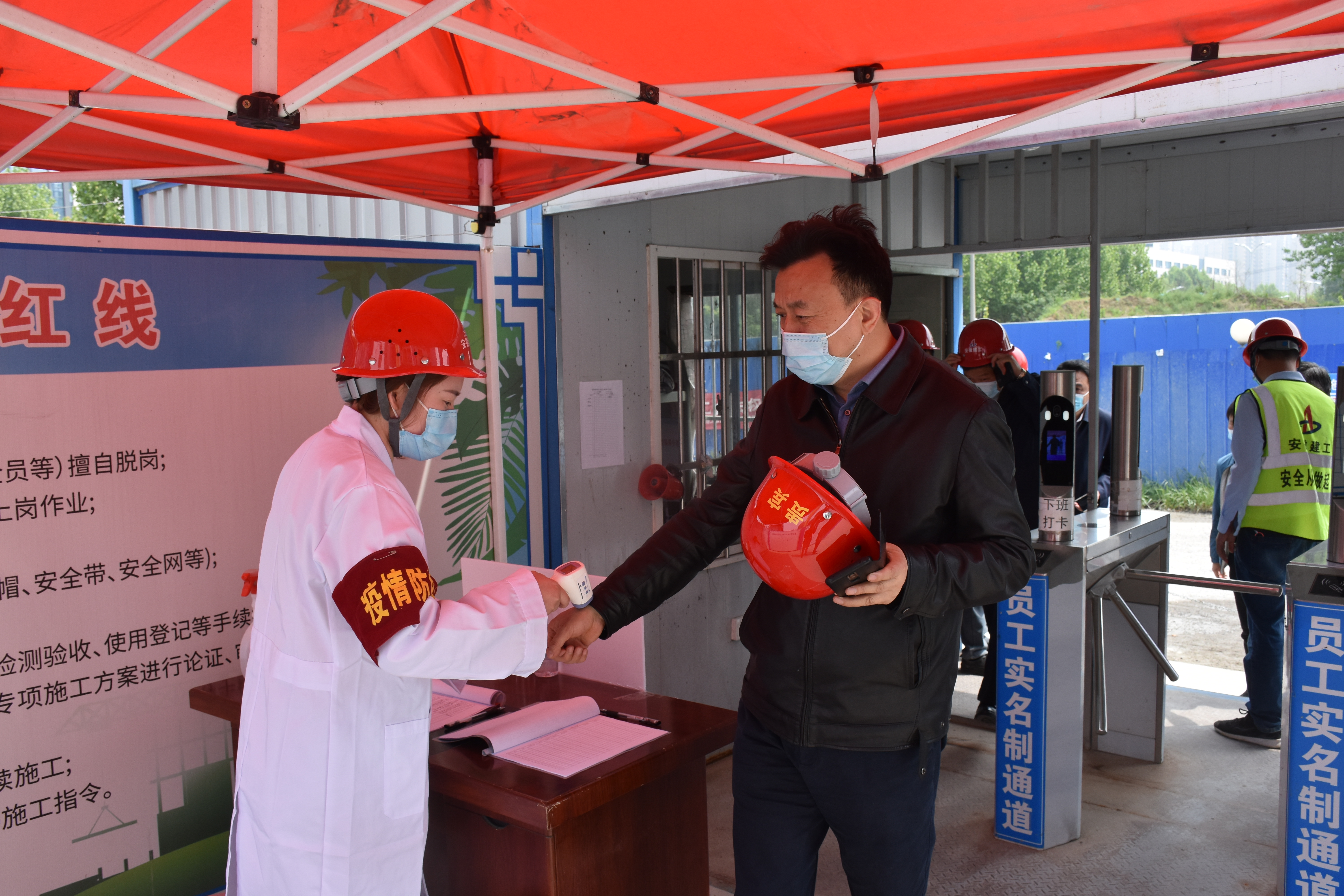 4月20日上午,建工控股黨委委員、紀委書記、監察專員王汪苗一行赴安徽二建文一春風里項目督導疫情防控工作,安徽二建黨委委員、副總經理葉和永,黨委委員、紀委書記沈壯參加督導。